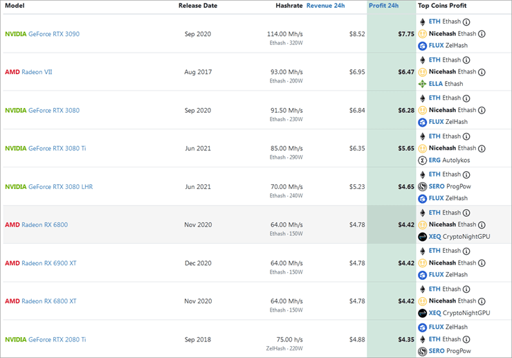 Calculate the mining rewards for cryptocurrencies mined using video cards (gpu's). 130.00 mh/s ethash · 330w. The table shows the most profitable graphics cards that can be used for cryptocurrency mining. Best gpus by profitability and hashrates. Your profit depends on the bitcoin exchange rate.
